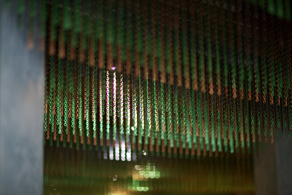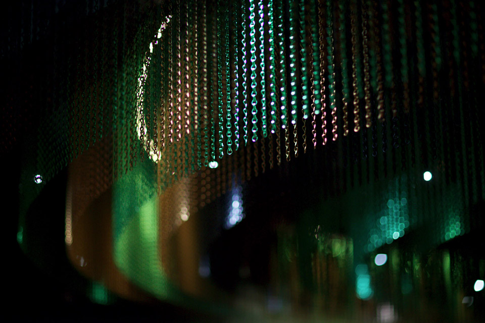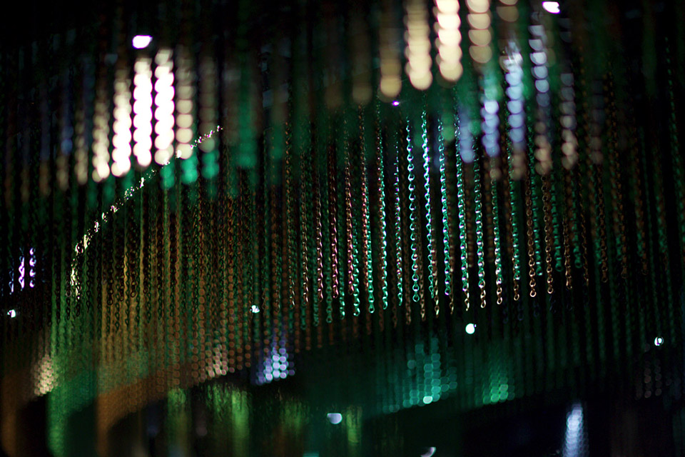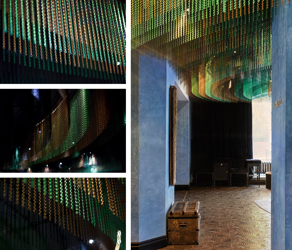 令人惊叹的彩色链条挂帘大概有95个单位的KriskaDECOR曲线挂帘装饰着大堂的天花板。使用的色彩包括绸缎褐色,绸缎黑色,绸缎咖啡色,绸缎绿色和闪亮的翡翠色。这些颜色的运用试图创造出大海底部和藻类的颜色。